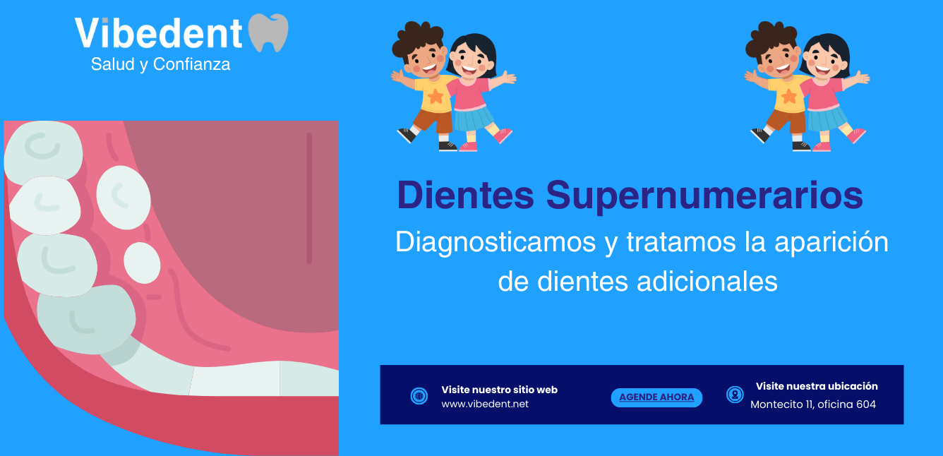 Los dientes supernumerarios son piezas dentales adicionales que aparecen en la boca además de la cantidad normal de dientes. Como estandar en la dentición primaria (de leche) hay 20 dientes y en la permanente hay 32 dientes.
